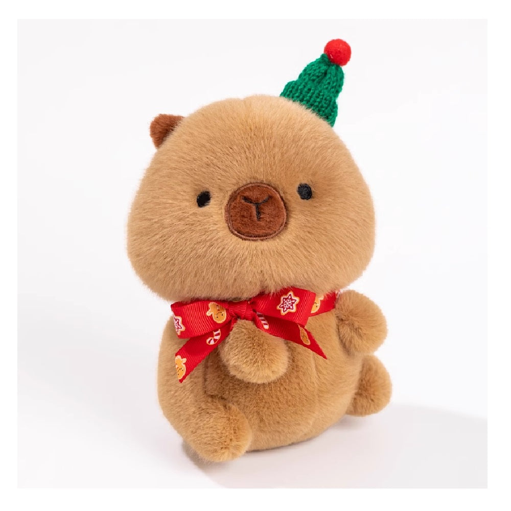 The brown and white capybaras are dressed in charming holiday attire, complete with scarves and festive accessories, making them perfect companions for the season. The Christmas Tree plush adds a touch of holiday magic with its vibrant green design, colorful ornaments, and fluffy white trim.