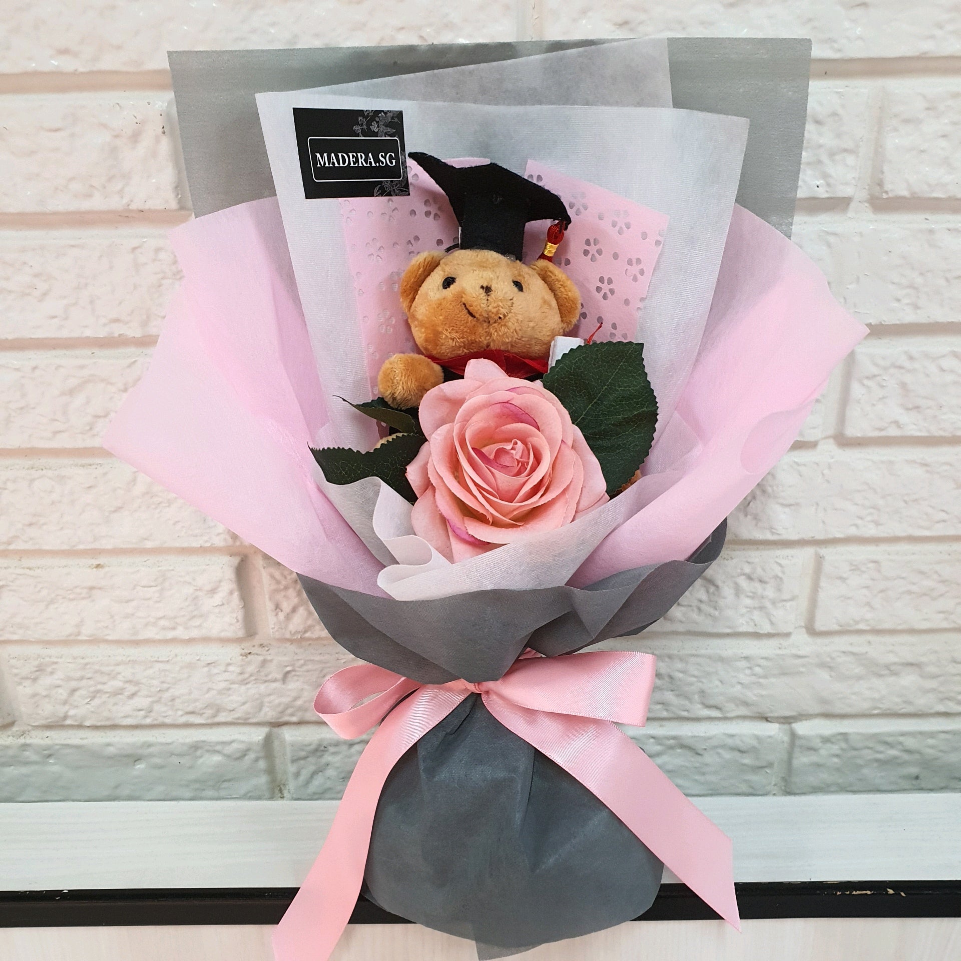 In front of the bear sits a stunning real-touch pink artificial rose, crafted to mimic the softness and beauty of a real bloom. Pink roses represent admiration, joy, and heartfelt congratulations—making it a perfect symbol for this proud moment. And unlike fresh flowers, this rose will never wilt, allowing your gift to be remembered long after the celebration ends.