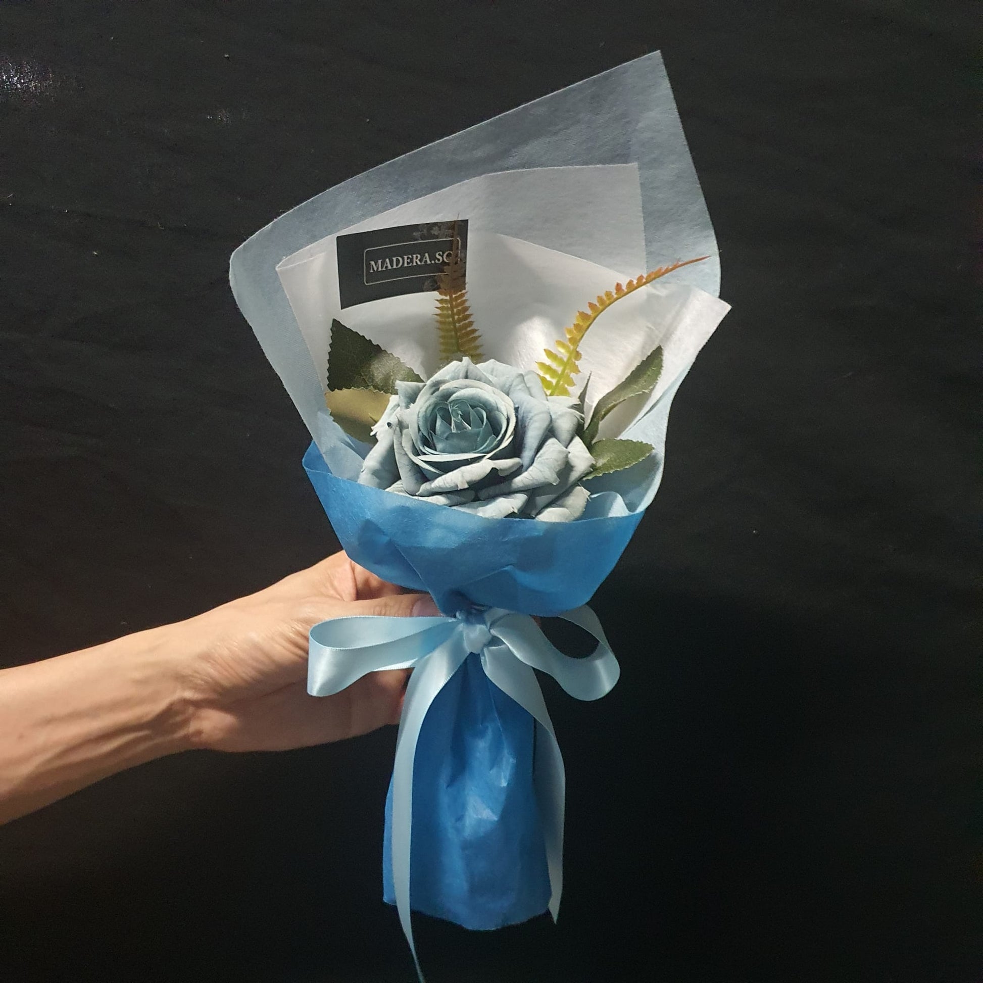 Introducing the Artificial 1-Head Diamond Rose Bouquet (Blue), a simple yet elegant arrangement featuring a soft blue rose at its center, delicately accented by its lush green leaves and two vibrant green ferns in the background. Wrapped in soft white and blue floral paper, with a matching blue ribbon, this charming bouquet is perfect for celebrating small moments or adding a touch of elegance to everyday occasions. Its minimalistic design adds warmth and grace, making it an ideal gift for intimate celebrations or to simply brighten someone's day. Est. H 35cm x W 17cm size.