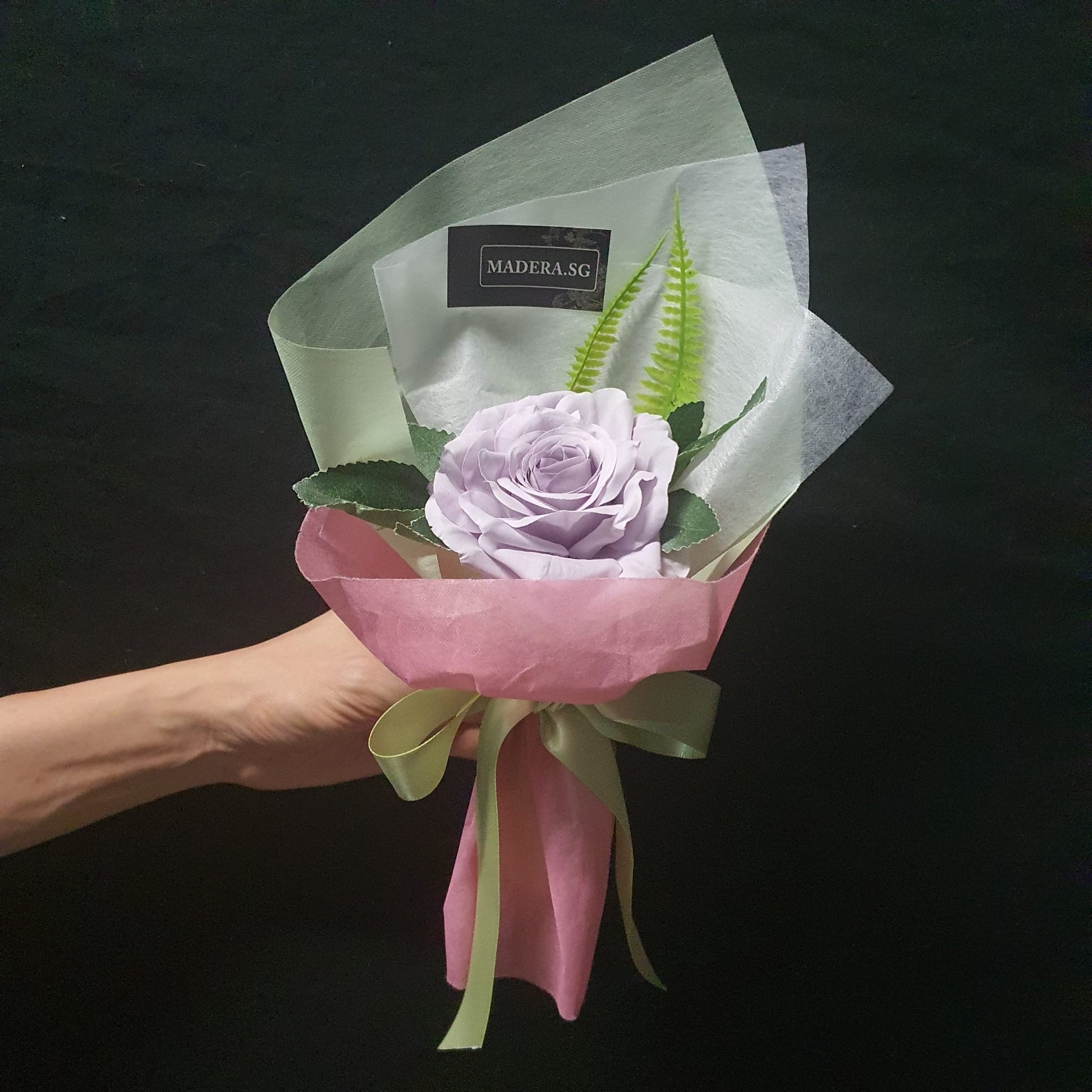 Introducing the Artificial 1-Head Diamond Rose Bouquet (Purple), a simple yet elegant arrangement featuring a soft purple rose at its center, delicately accented by its lush green leaves and two vibrant green ferns in the background. Wrapped in soft purple, grey and soft red floral paper, with a matching gray ribbon, this charming bouquet is perfect for celebrating small moments or adding a touch of elegance to everyday occasions. Its minimalistic design adds warmth and grace, making it an ideal gift for intimate celebrations or to simply brighten someone's day. Est. H 35cm x W 17cm size.