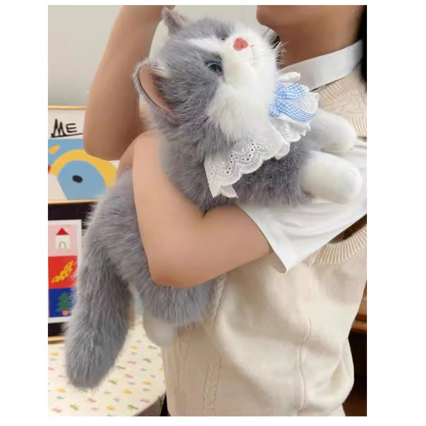 The Grey Ragdoll Cat combines modern style with classic comfort. Adorned with a beautiful white lace collar, this 40cm plush mimics the sweet expression and markings of a real Ragdoll breed. It is designed with sensory integration in mind, using weighted particles to provide deep-pressure input that helps stabilize emotions during a hug.