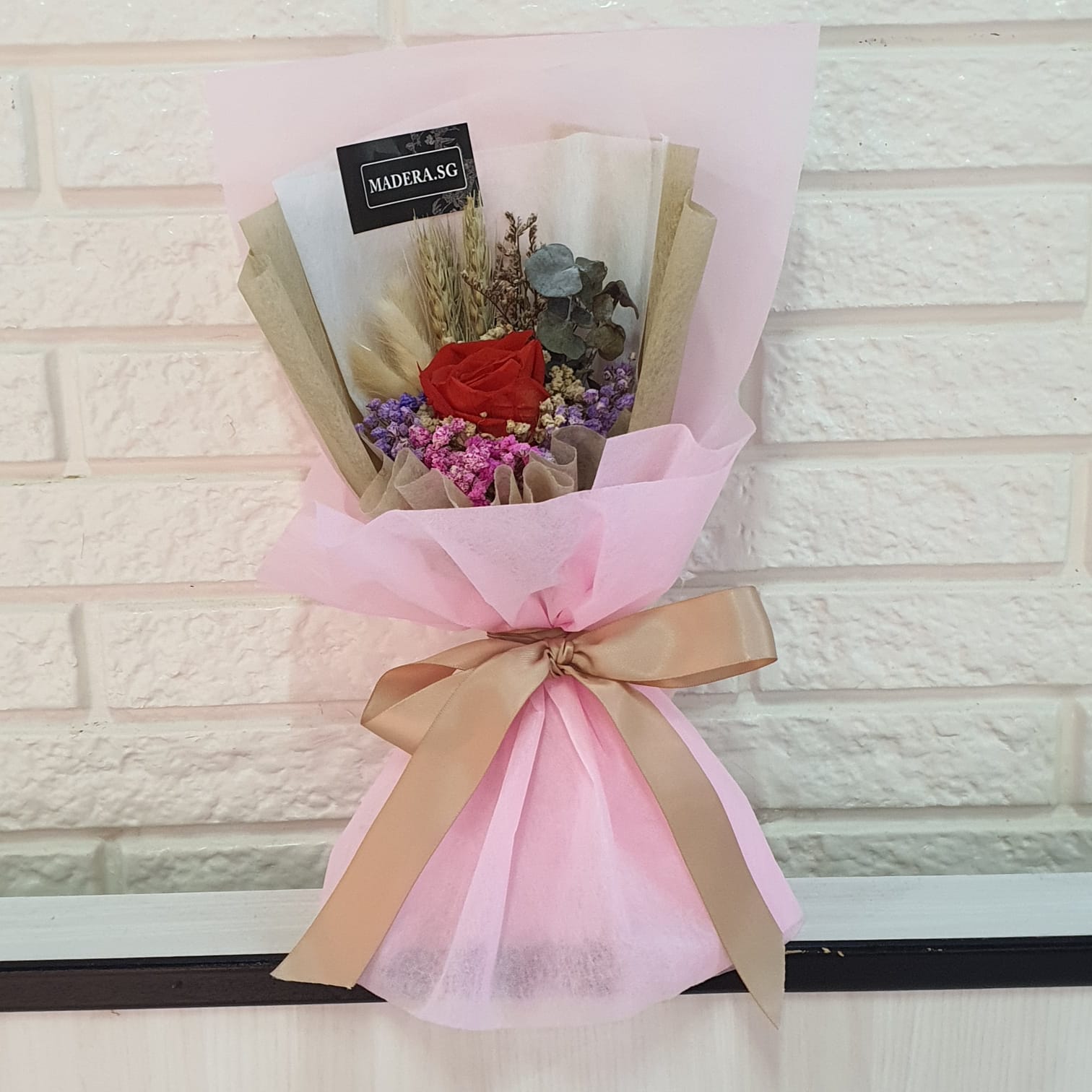 Introducing the Preserved 1 Head Red Rose Baby Breath Bouquet with Pink Tone Wrap, a stunning medium-sized bouquet featuring a beautifully preserved red rose as its centerpiece. The arrangement is elevated with soft eucalyptus leaves, a mix of natural white dried fillers, and vibrant, colorful dried baby’s breath in shades of blue, pink, white, and purple. Wrapped elegantly in a special brown floral wrapper with a white backdrop and a soft pink outer wrap, finished with a gold ribbon to add a touch of sophistication.