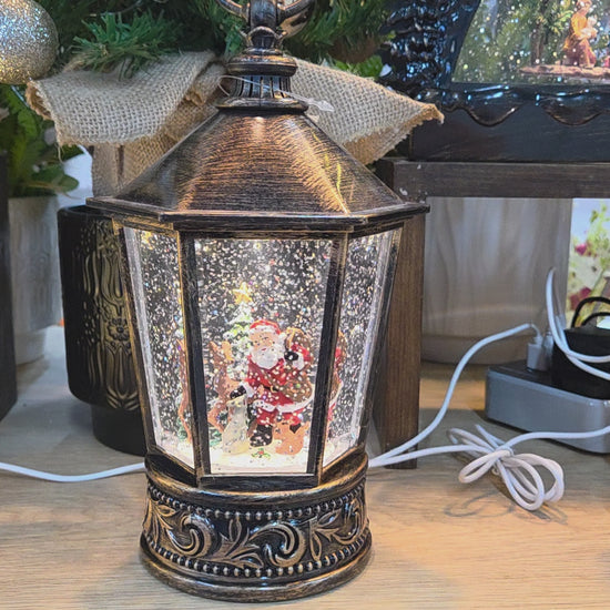 Bring the magic of Christmas into any room with our Santa Hexagon Snowing Music Lamp, a beautifully crafted holiday décor piece that captures the timeless charm of the season. Measuring 14 × 14 × 22 cm, this elegant lamp is designed in a classic hexagon shape with an antique-style finish, making it a standout decoration for homes, offices, shops, and festive displays.Once switched on, the lamp comes alive with gentle swirling snowflakes, creating a mesmerizing snow-globe effect that instantly enhances the Christmas ambiance. Warm lights illuminate Santa inside, while the sparkling snow dances around him, turning any space into a cozy winter wonderland.